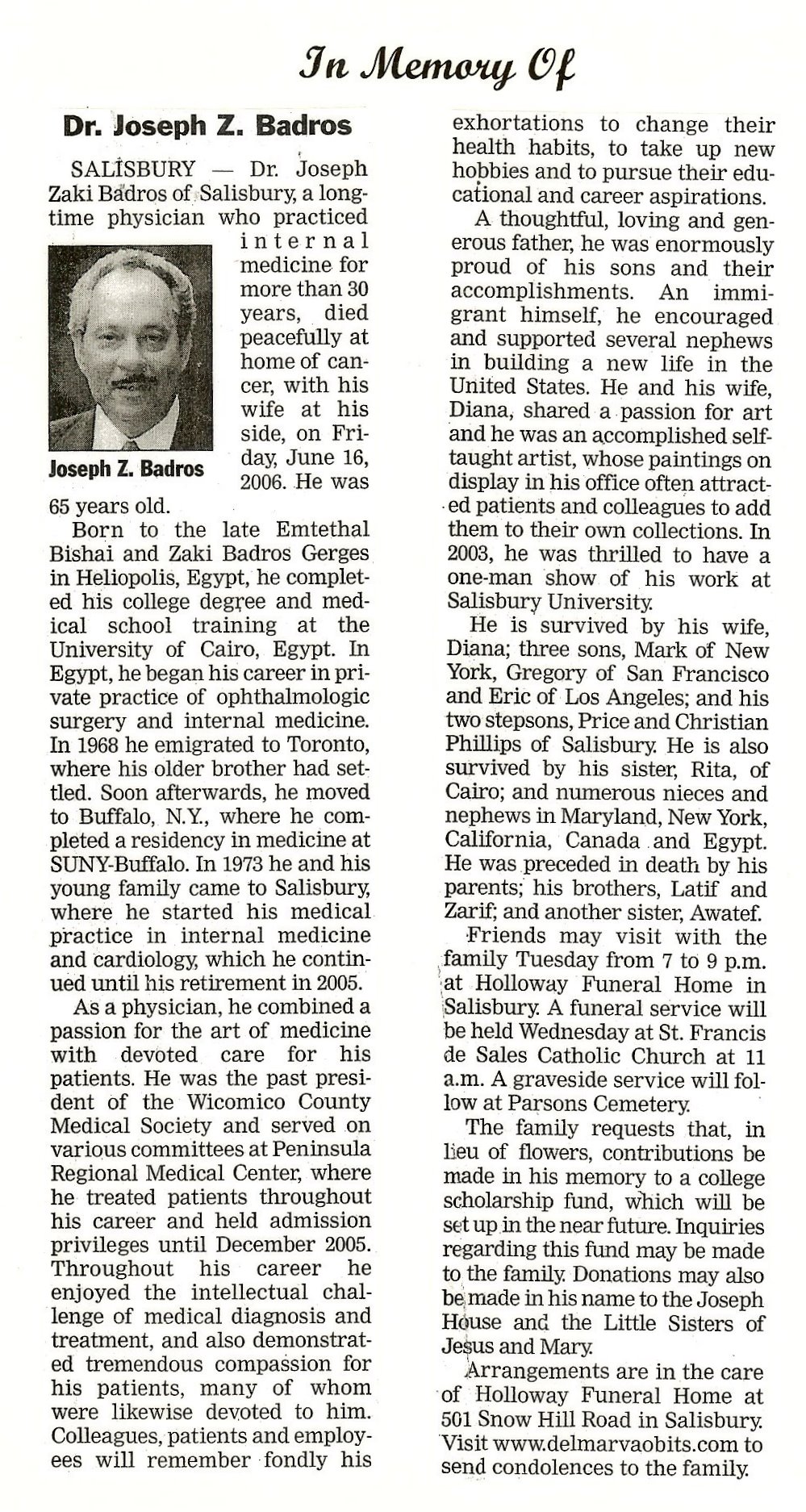 Joseph Zaki Badros (1940-2006) Obituary